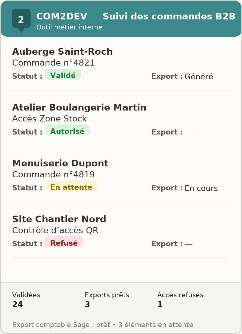 – Suivi des commandes B2B + export comptable sans ressaisie.